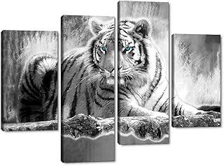 4パネル タイガー キャンバス ウォールアート モダン 野生動物 ポスター ホームインテリア 白黒 写真 壁装飾 アートワーク リビングルーム ベッドルーム ホーム オフィス デコレーション 枠張り済み - 幅56インチ x 高さ42インチ
